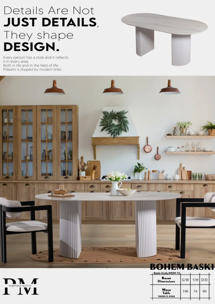 Modern çizgileriyle dikkat çeken bu masa, sağlam gövdesi ve zarif detaylarıyla evinizin en özel alanlarına şıklık kazandırır.