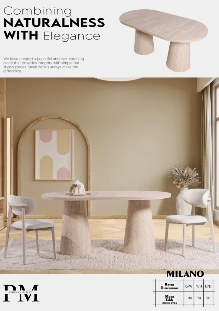 Modern çizgileriyle dikkat çeken bu masa, sağlam gövdesi ve zarif detaylarıyla evinizin en özel alanlarına şıklık kazandırır.